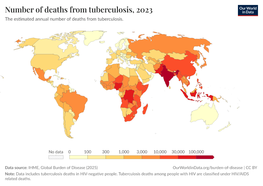 “Data Page: Number of deaths from tuberculosis”, part of the following publication: Esteban Ortiz-Ospina and Max Roser (2016) - “Global Health”. Data adapted from IHME, Global Burden of Disease. Retrieved from https://refactor-responseset-ergonom.owid.pages.dev:8789/20260211-174736/grapher/tuberculosis-deaths.html [online resource] (archived on February 11, 2026).How to cite this data