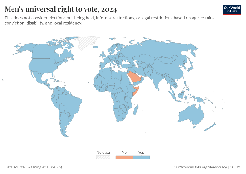 Skaaning et al. (2025) – processed by Our World in Data. “Men's universal right to vote” [dataset]. Skaaning et al., “Lexical Index of Electoral Democracy (LIED) v6.8” [original data]. Retrieved February 26, 2026 from https://refactor-responseset-ergonom.owid.pages.dev:8789/20260119-065148/grapher/universal-suffrage-men-lexical.html (archived on January 19, 2026).
