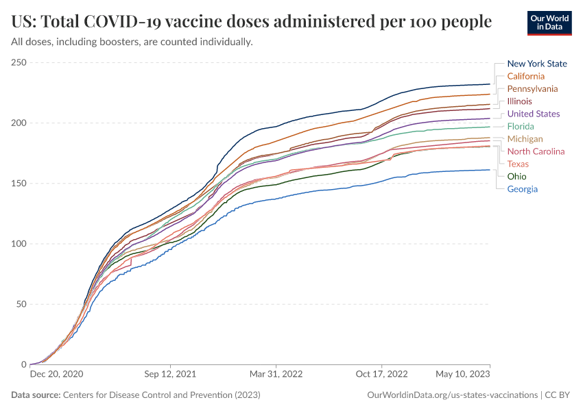 Centers for Disease Control and Prevention (2023) – processed by Our World in Data. “US: Total COVID-19 vaccine doses administered per 100 people” [dataset]. Centers for Disease Control and Prevention, “COVID-19, Vaccinations (United States)” [original data]. Retrieved February 26, 2026 from https://refactor-responseset-ergonom.owid.pages.dev:8789/20250909-093708/grapher/us-state-covid-vaccines-per-100.html (archived on September 9, 2025).