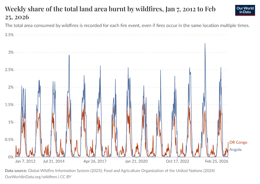 Global Wildfire Information System (2026); Global Wildfire Information System (2024); Food and Agriculture Organization of the United Nations (2024) – with minor processing by Our World in Data. “Weekly share of the total land area burnt by wildfires” [dataset]. Global Wildfire Information System, “Seasonal wildfire trends”; Food and Agriculture Organization of the United Nations, “Land, Inputs and Sustainability: Land Use” [original data]. Retrieved February 26, 2026 from https://refactor-responseset-ergonom.owid.pages.dev:8789/20260220-091140/grapher/weekly-share-of-the-total-land-area-burnt-by-wildfires.html (archived on February 20, 2026).