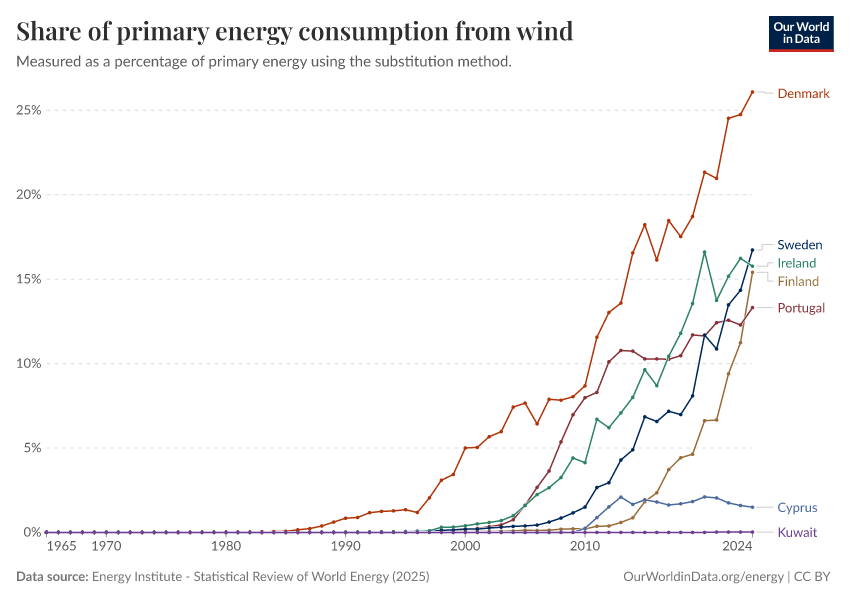 Energy Institute - Statistical Review of World Energy (2025) – with major processing by Our World in Data. “Share of primary energy consumption that comes from wind power – Using the substitution method” [dataset]. Energy Institute, “Statistical Review of World Energy” [original data]. Retrieved February 26, 2026 from https://refactor-responseset-ergonom.owid.pages.dev:8789/20260119-070102/grapher/wind-share-energy.html (archived on January 19, 2026).
