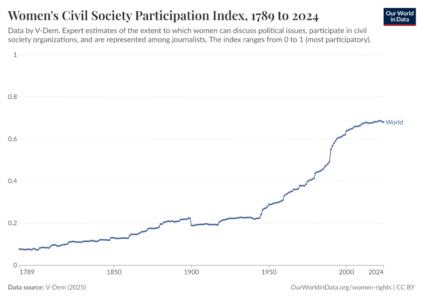 “Data Page: Women's civil society participation index”, part of the following publication: Bastian Herre, Lucas Rodés-Guirao, and Esteban Ortiz-Ospina (2013) - “Democracy”. Data adapted from V-Dem. Retrieved from https://refactor-responseset-ergonom.owid.pages.dev:8789/20260119-070102/grapher/women-civil-society-participation-index.html [online resource] (archived on January 19, 2026).