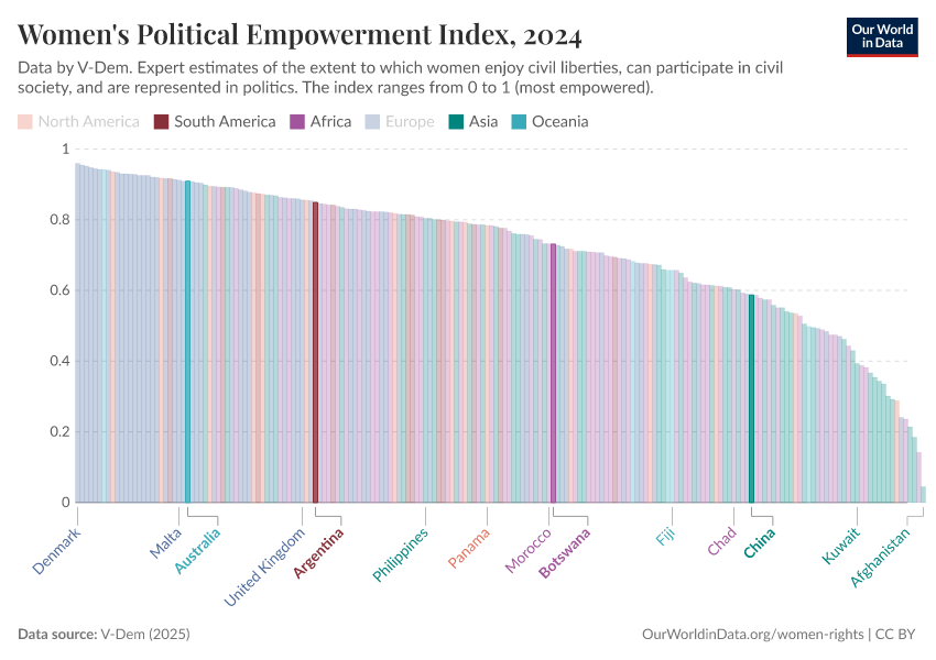 “Data Page: Women's political empowerment index”, part of the following publication: Bastian Herre, Lucas Rodés-Guirao, and Esteban Ortiz-Ospina (2013) - “Democracy”. Data adapted from V-Dem. Retrieved from https://refactor-responseset-ergonom.owid.pages.dev:8789/20260119-070102/grapher/women-political-empowerment-index.html [online resource] (archived on January 19, 2026).How to cite this data