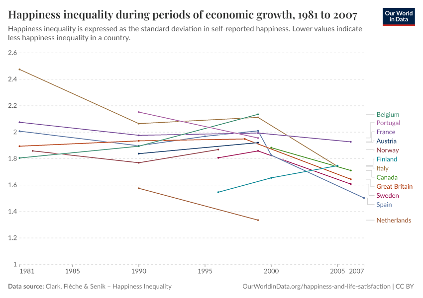 The results from Stevenson and Wolfers for the US are consistent with other studies looking at changes in happiness inequality (or life satisfaction inequality) in different countries. In particular, researchers have noted that there is a correlation between economic growth and reductions in happiness inequality—even when income inequality is increasing at the same time. The visualization below, from Clark, Fleche, and Senik (2015)4 shows this. It plots the evolution of happiness inequality within a selection of rich countries that experienced uninterrupted GDP growth.