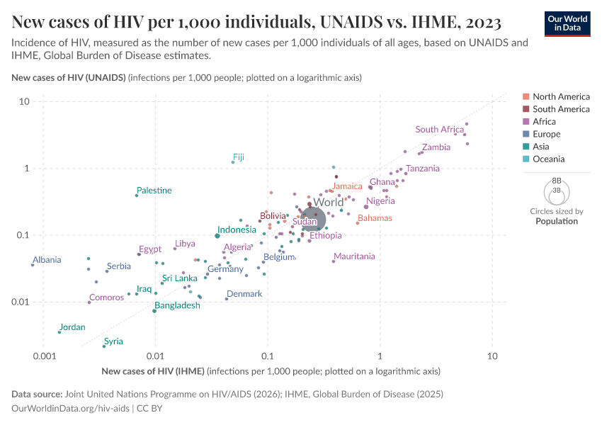 Several sources publish estimates on HIV and AIDS. Two of the most established sources, presented on this page, are UNAIDS and the Institute of Health Metrics and Evaluation (IHME). The charts below show a comparison of these two sources' estimates.