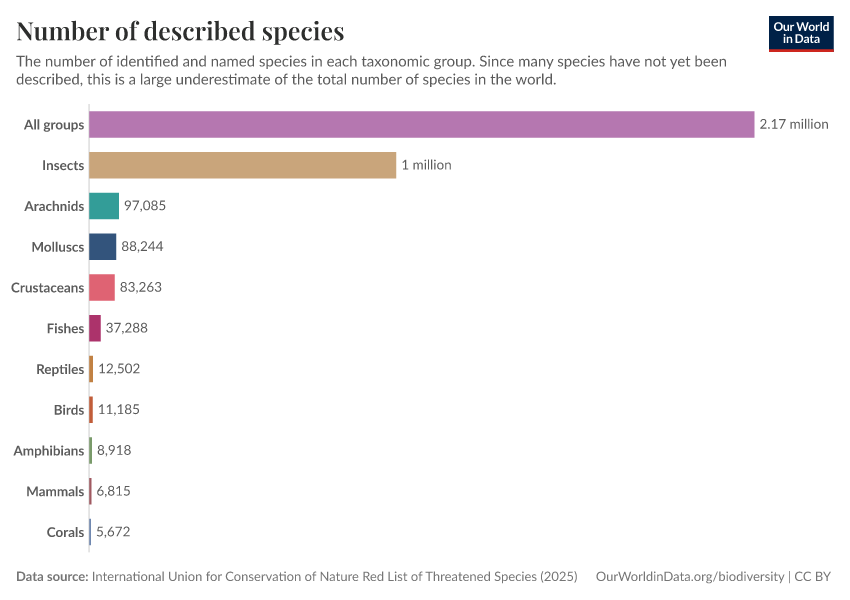 Hannah Ritchie (2022) - “How many species are there?” Published online at OurWorldinData.org. Retrieved from: 'https://refactor-responseset-ergonom.owid.pages.dev:8789/20260106-083806/how-many-species-are-there.html' [Online Resource] (archived on January 6, 2026).BibTeX citation