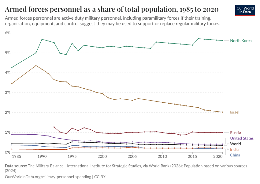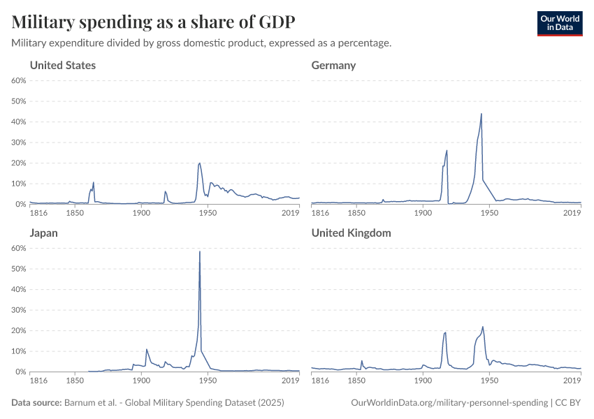Esteban Ortiz-Ospina (2018) - “Long-run trends in military spending and personnel: four key facts from new data” Published online at OurWorldinData.org. Retrieved from: 'https://refactor-responseset-ergonom.owid.pages.dev:8789/20260202-181317/military-long-run-spending-perspective.html' [Online Resource] (archived on February 2, 2026).BibTeX citation