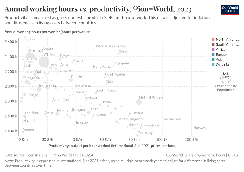 Higher labor productivity is associated with fewer working hours, as shown in the chart here with labor productivity on the horizontal axis and annual working hours on the vertical axis. The chart currently shows data for the latest available year, but you can explore this relationship over time since 1950 by using the blue time slider at the bottom of the chart.