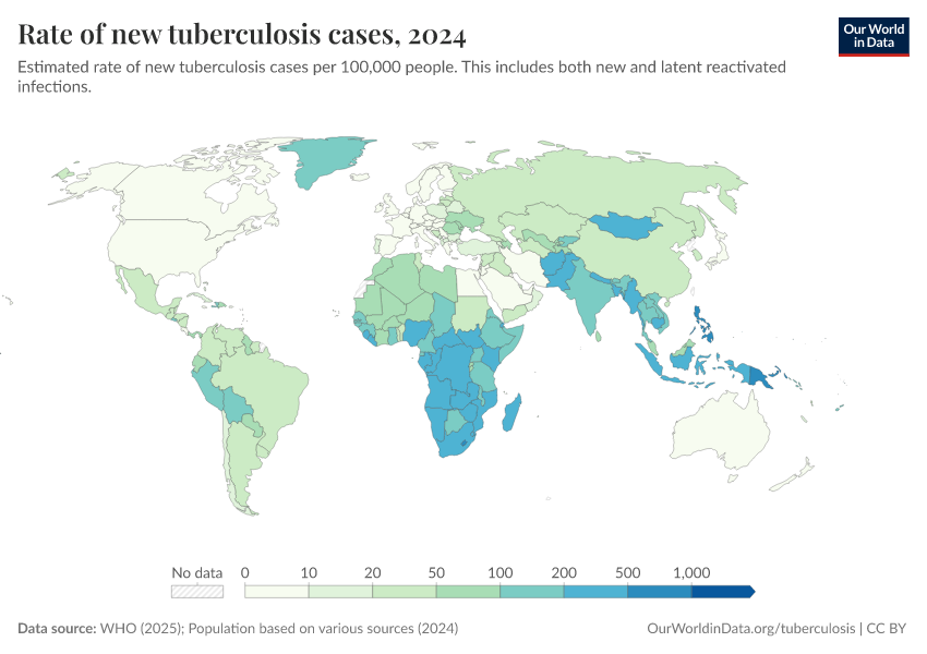 Saloni Dattani, Fiona Spooner, Hannah Ritchie, and Max Roser (2023) - “Tuberculosis” Published online at OurWorldinData.org. Retrieved from: 'https://refactor-responseset-ergonom.owid.pages.dev/tuberculosis' [Online Resource]BibTeX citation