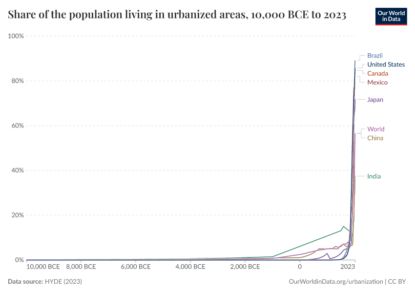 The recency of urbanization becomes even more pronounced when we look at trends for countries and regions over even longer timescales – the past 10,000 years. This is shown in the visualization here, derived from the work of the History Database of the Global Environment.11