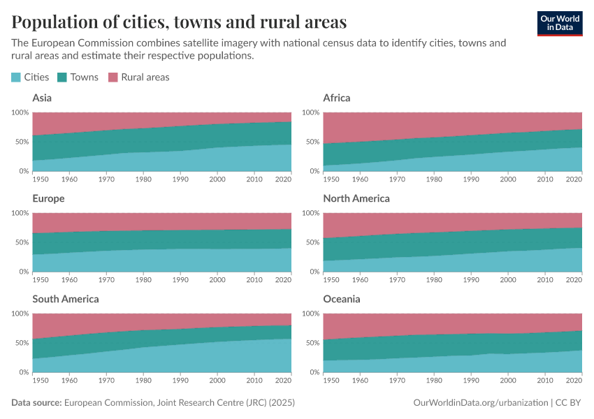However, the manual on how to apply the Degree of Urbanization recommends reporting figures across three distinct categories—cities, towns, and villages—rather than using a simple urban-rural dichotomy. This approach recognizes urbanization as a continuum, acknowledging that towns occupy a unique position, differing significantly from both cities and villages in their characteristics and needs. The reported cities, and towns population shares by continent are shown in the chart below.