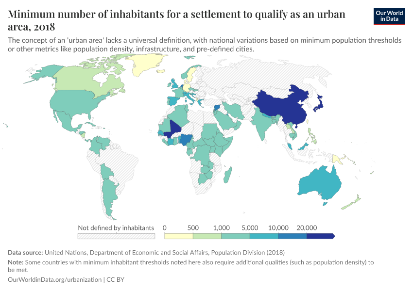 Note that 133 countries do not use a minimum settlement population threshold in their 'urban' definition. Some use a variation of population density, infrastructure development, pre-assigned city populations, or in some cases no clear definition.
