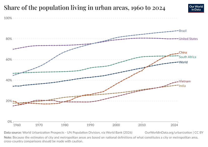 Hannah Ritchie, Veronika Samborska, and Max Roser (2024) - “Urbanization” Published online at OurWorldinData.org. Retrieved from: 'https://refactor-responseset-ergonom.owid.pages.dev/urbanization' [Online Resource]BibTeX citation