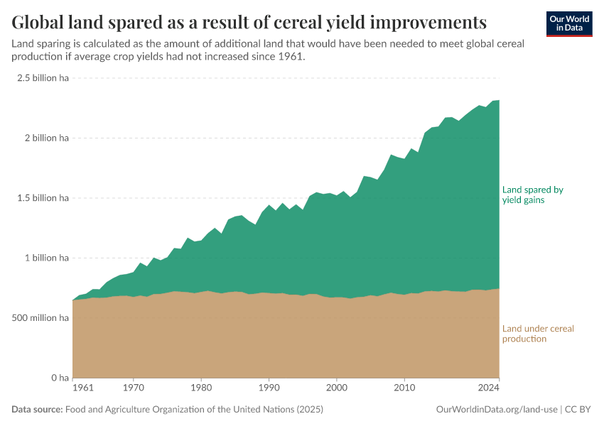 If global average cereal yields were to have remained at their 1961 levels, we can see (in red) the amount of additional land we would have had to convert to arable land to achieve the same levels of cereal production. This 'spared' land is large – close to the area of the United States and India combined.