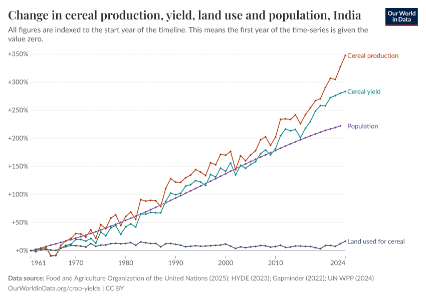 Hannah Ritchie (2017) - “Yields vs. land use: how the Green Revolution enabled us to feed a growing population” Published online at OurWorldinData.org. Retrieved from: 'https://refactor-responseset-ergonom.owid.pages.dev:8789/20260119-235736/yields-vs-land-use-how-has-the-world-produced-enough-food-for-a-growing-population.html' [Online Resource] (archived on January 19, 2026).BibTeX citation